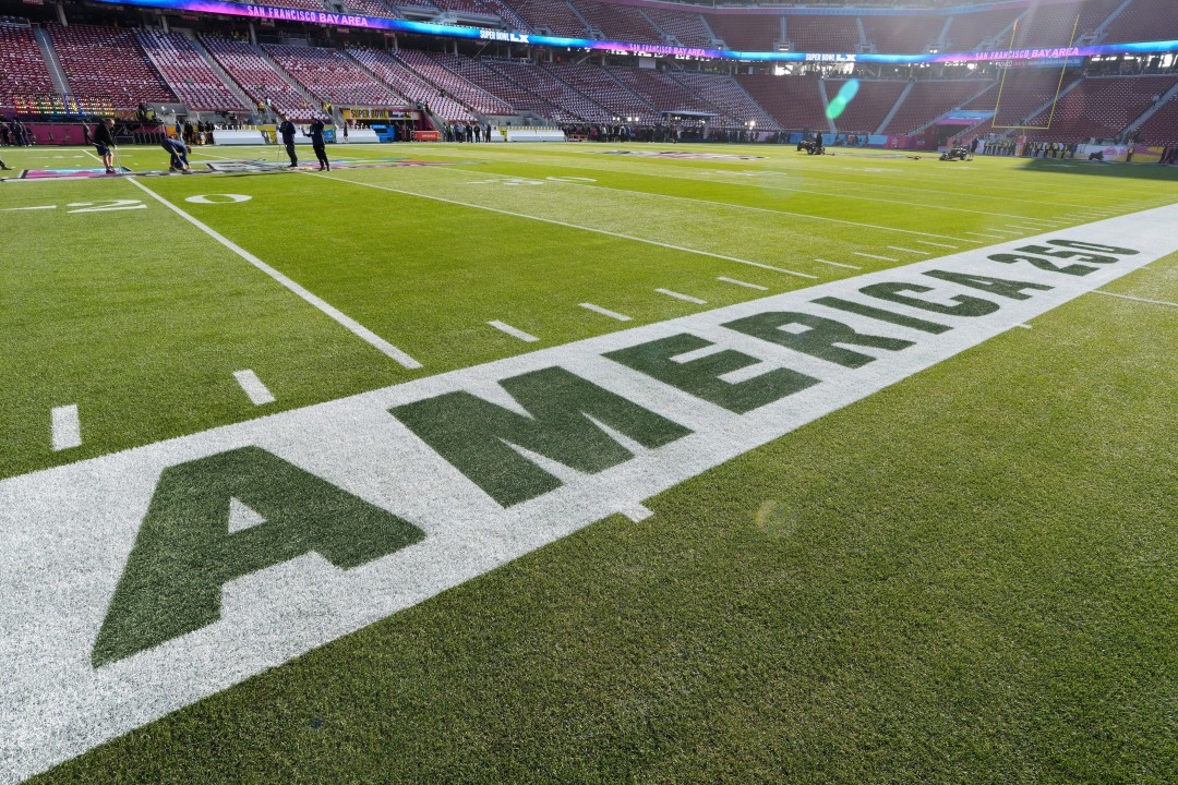 America 250 displayed ahead of the NFL Super Bowl 60 football game on Sunday, Feb. 8, 2026, in Santa Clara, California.   (AP Photo/Doug Benc)